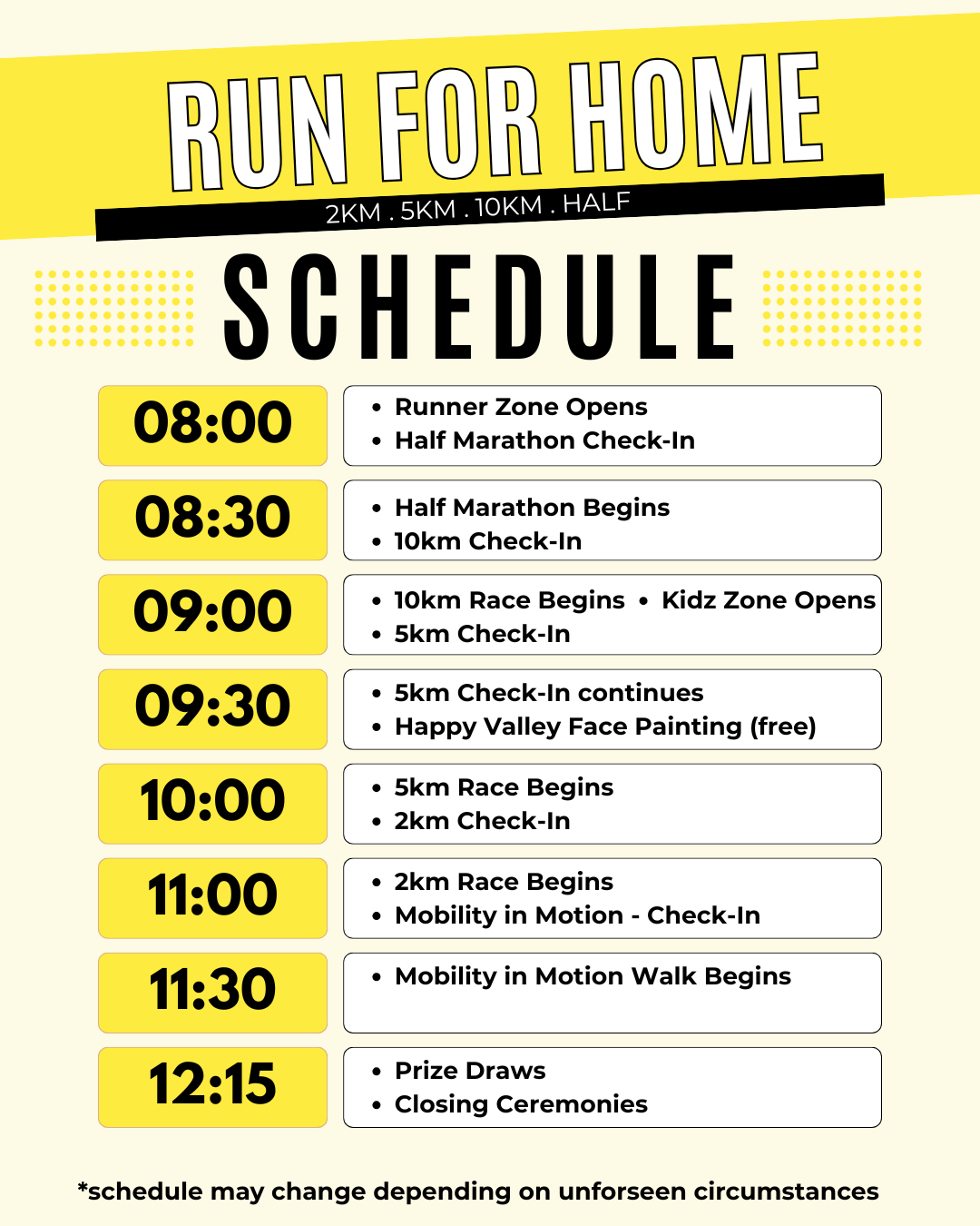 In an attempt to attract a wider demographic of participants, Run For Home encourages seasoned runners to put their abilities to the test with either a 10km run, or a half marathon, but also allows for those who just want to walk, taking part in a community event, with a 2km trail and a 5km trail. The event is open to all ages and all levels of experience.